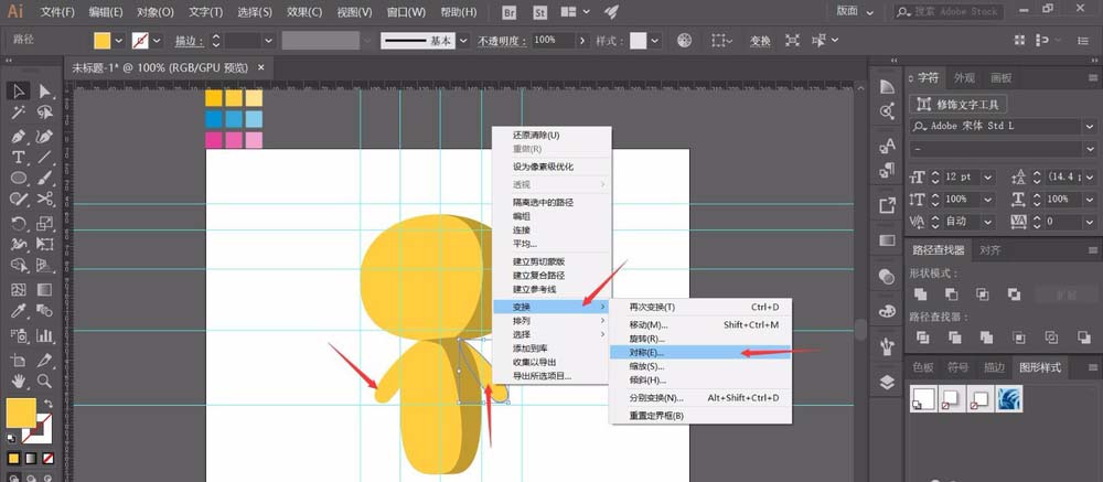 9、选中绘制的手臂图形,鼠标右键点击,在弹出的菜单栏中选择“变换——对称”,确定对称命令后,就可以镜像出只有方向相反的相同图案,可以作为另一只手臂。