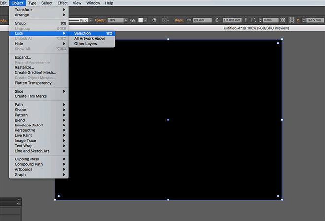 首先打开Adobe Illustrator并创建一个新文档。这些效果最适合在黑暗的背景下工作,因此绘制一个矩形来覆盖画板,然后给它一个黑色的填充。锁定形状,以避免使用CMD + 2快捷键或对象>锁定>选择菜单意外选择它。