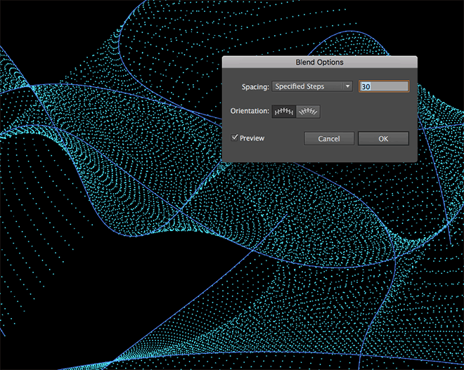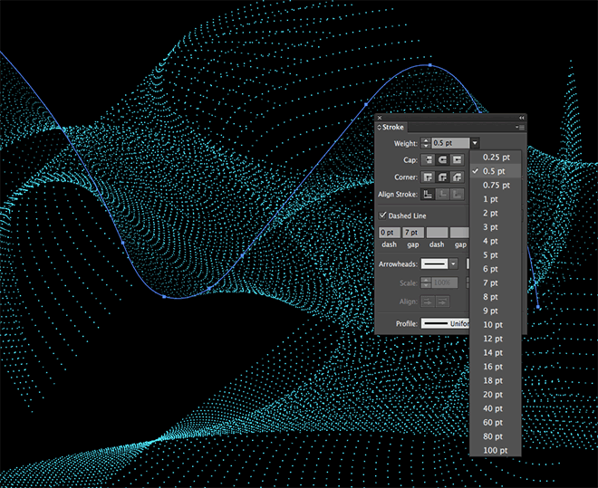 将这种数字粒子效果与使用Illustrator的Blend工具制作的典型波形图形区分开的一个重要步骤是设置一个虚线笔划以创建一系列点。在所有路径中绘制选择并在“笔划”面板中启用圆角选项,然后将虚线设置为0pt Dash和7pt Gap。
