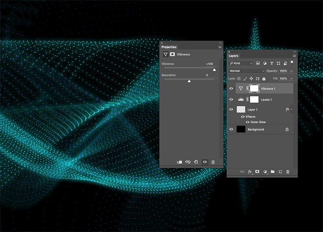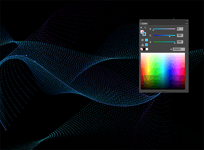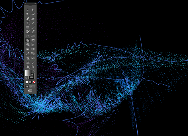 最终结果t是一个科幻启发的数字粒子波与一个明亮的发光点阵列。虽然大多数最终的Photoshop调整可能是直接在Illustrator,复杂的艺术品很快会导致内存问题。