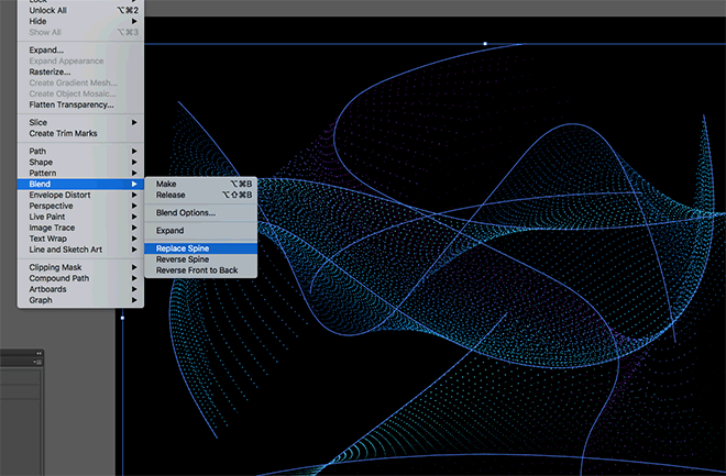 要进一步扭曲线,在混合内绘制一个随机路径,然后在所有内容周围绘制选区。转到对象>混合>替换脊柱。