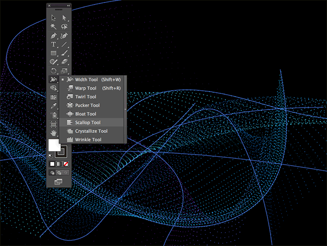 为了创造真正复杂的效果,实验扇形,结晶和皱纹工具。双击工具图标以编辑大小设置以覆盖艺术作品的大部分,然后单击跨路径以扭曲它们。