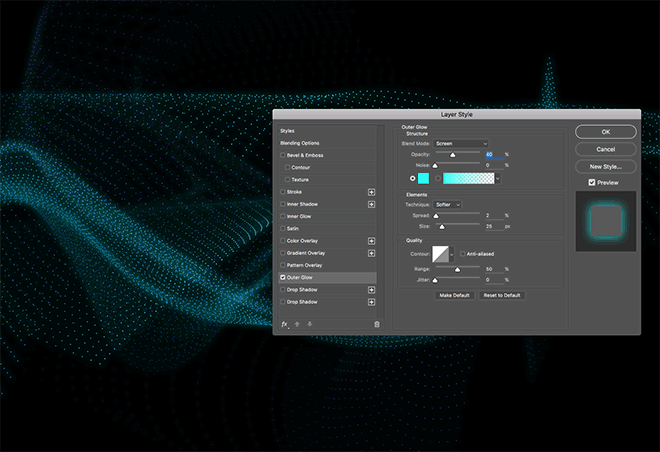 使用CMD + Backspace快捷键用黑色填充背景,然后粘贴Illustrator图稿。将其缩放至大小,然后按Enter键将其设置到位。双击图层并添加具有鲜艳青色颜色(屏幕混合模式,2%展开,25像素大小)的外发光层样式,然后减少不透明度以降低发光效果的影响。