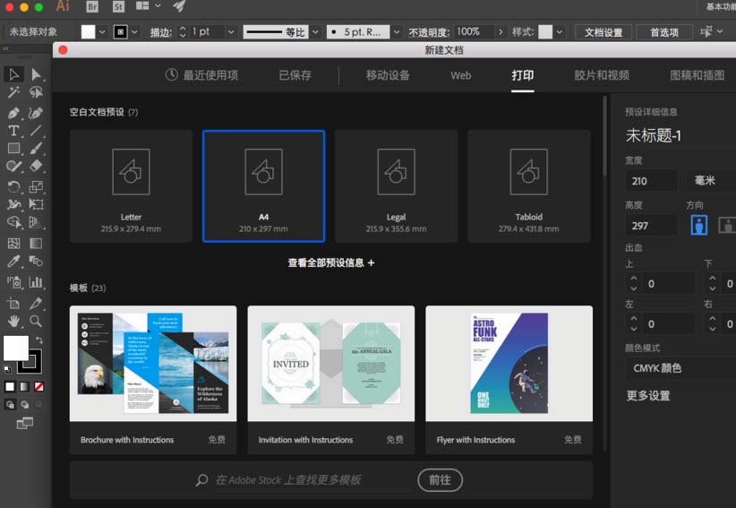 打开 AI,点击新建,建立一个 A4的文件,AI里一般有模板可以选择,找不到的朋友可以手动输入210*297mm 即可。可以在网上寻找自己喜欢的简历模板,进行模仿。