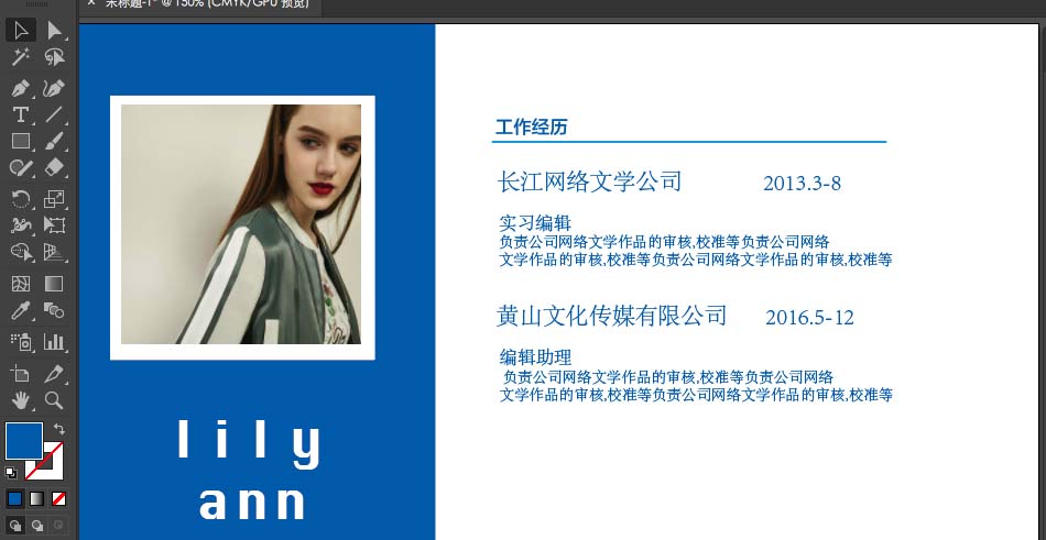 用文字工具输入工作经历,用直线工具画一条长线,作为视觉上一个分割的效果,然后依次写上工作过的公司,工作的时间,所在的职位以及工作负责的内容,这样可以让简历更加有条理.复制工作经历部分的内容,改为教育经历,修改内容.(图片内容纯属于虚构,希望大家能更关注版式布局)。