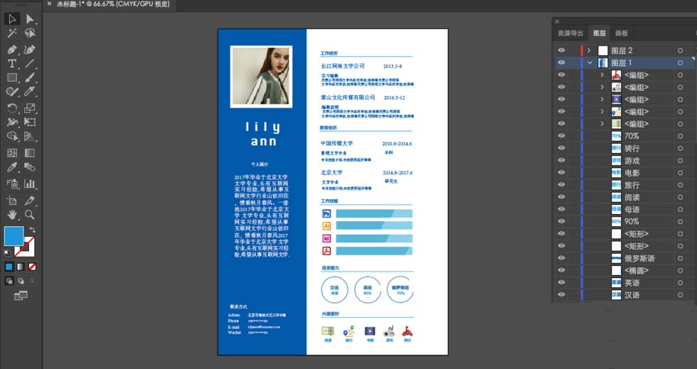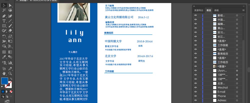 如今工作竞争越来越激烈,拥有一份简洁有条理的简历,也会使面试加分呢.赶快用 AI 动手做一份属于自己的简历吧,效果如下图。此教程适合对 AI 工具有所了解的新手,从未使用过软件的朋友可以了解一下各部分工具的功能,再进行制作。