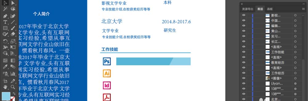 再次复制工作经历和分割线,将标题改成工作技能.这里用了一些软件的小图标,目的也是为了给简历增加细节,这些图标可以在网上下载,百度图标, icon 即可。(jpg 的格式就可以.将下载的 jpg 格式置入 AI 就可以了)也可以下载 Ai格式的图标,主要看个人习惯。