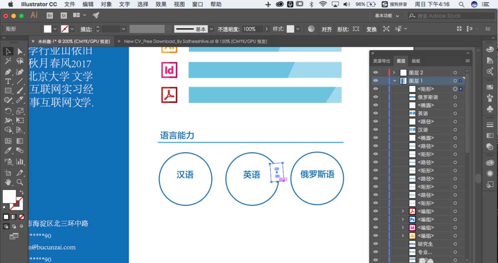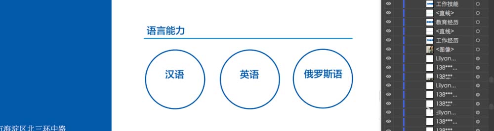 复制上部分工作经验及分割线,修改成语言能力,用椭圆工具,按住 shift 建立一个正圆形,填充颜色改为透明,边框为商务蓝,用文字工具输入汉语,然后复制,修改内容, 再用长方形工具,画一个白色长方形遮住圆形的部分,(大家根据实际需要来设计吧)依次类推做好第三个圆.最后输入下面的小字,内容也可以改成等级证书之类的。