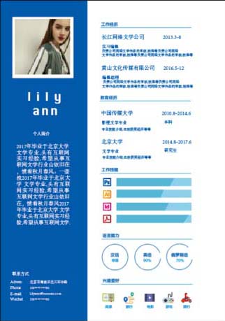 在白色照片框下建立一个无色透明的长方形框,然后用文字工具输入自己的名字.(图片输入的文字内容纯属于虚构)将名字的姓和名分行,放置白色照片框的下方中央,(也可以直接用文字工具输入,看个人习惯)依次输入个人简介,个人信息介,个人联系方式绍等文字内容,后面的个人联系方式为了使简历的视觉上看起来丰富加入了英文字体,追求完美的朋友也可以在上面的中文内容后面加上英文翻译。