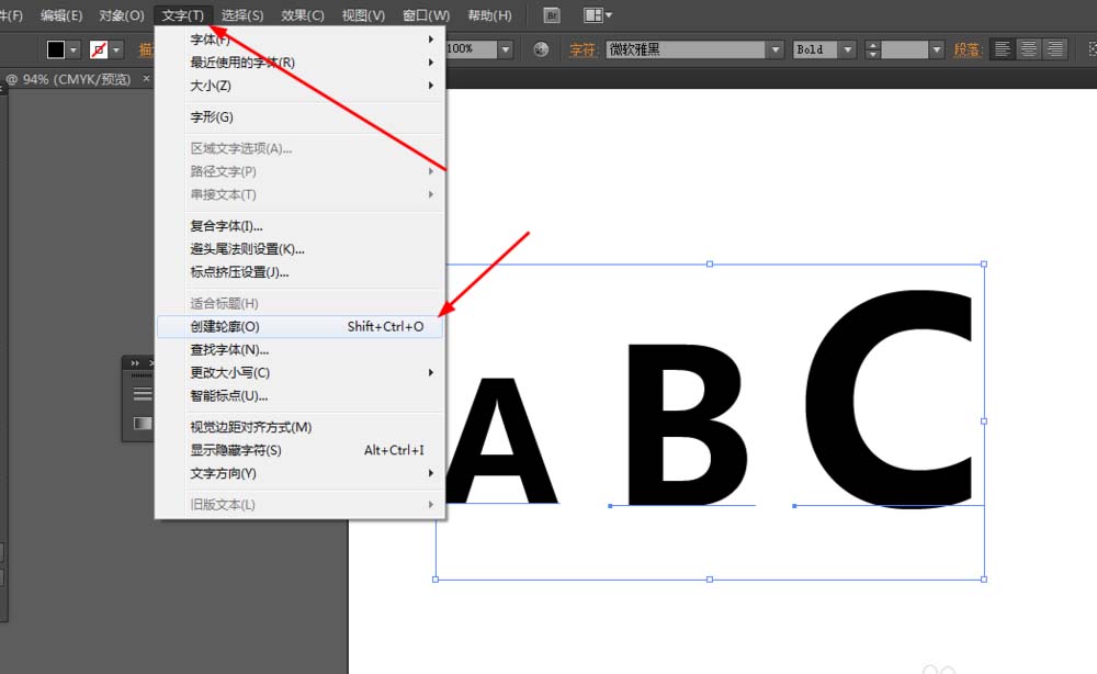 2、然后选中字母到文字—创建文字轮廓,如图所示