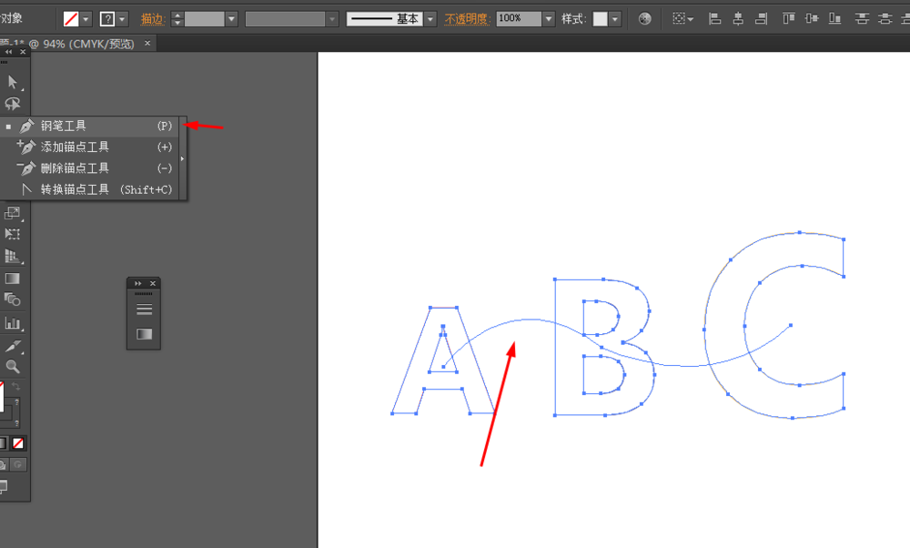 5、选择钢笔工具,勾出一条路径,再选中字母和路径到对象—混合—建立,如图所示