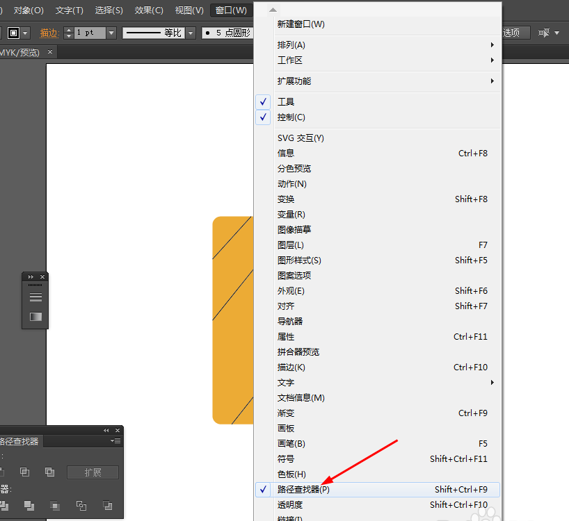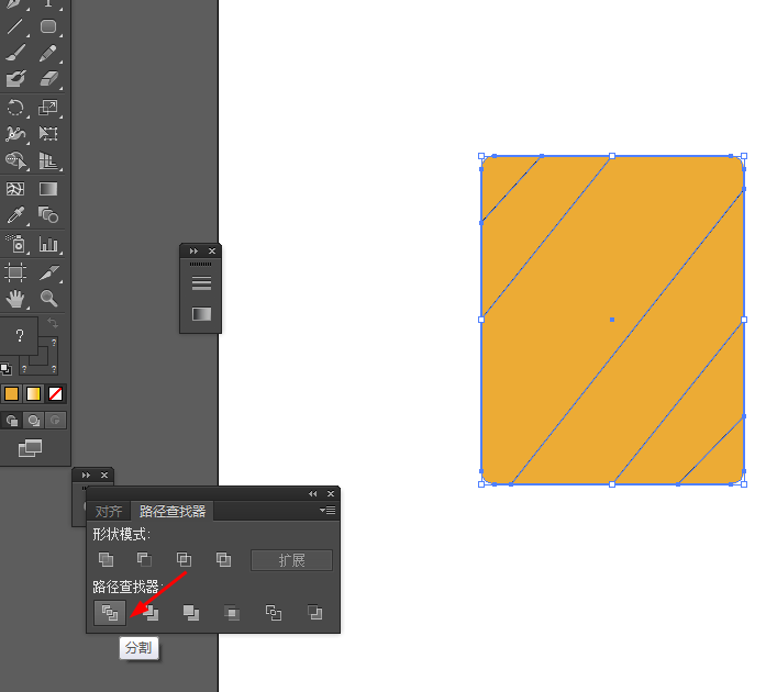 2、然后选择直线工具,在圆角图形上画5条直线,再选中直线和圆角矩形到窗口—路径—路径查找器—点击分割,如图所示