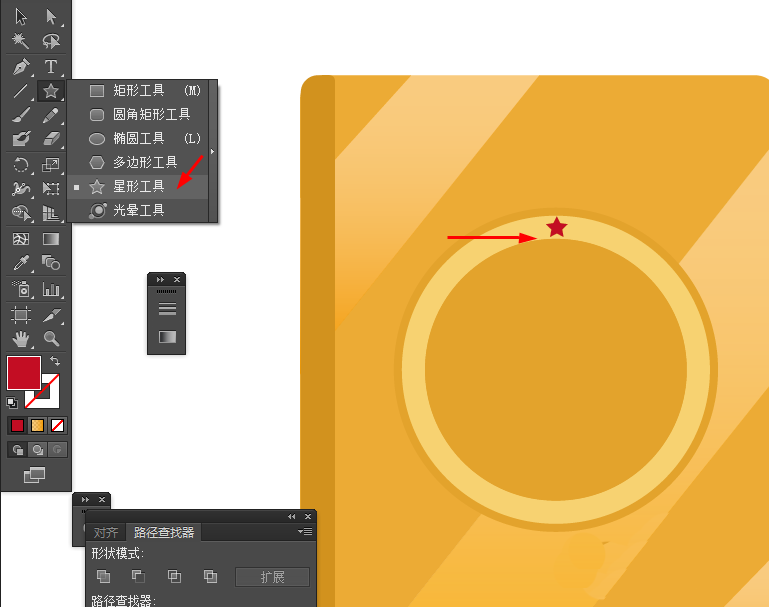 9、选择星形工具,在圆形画一个星星,并填充颜色,如图所示
