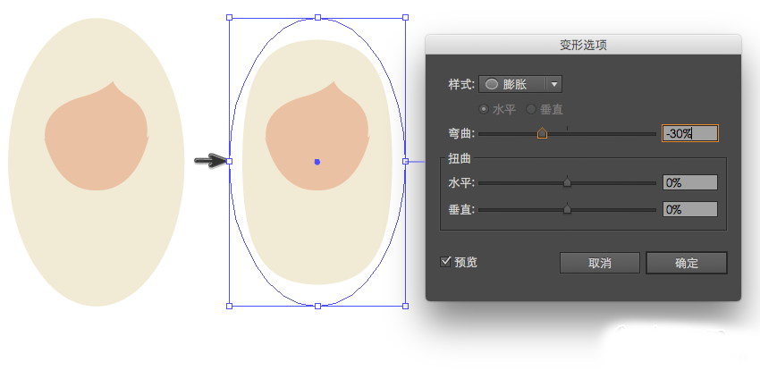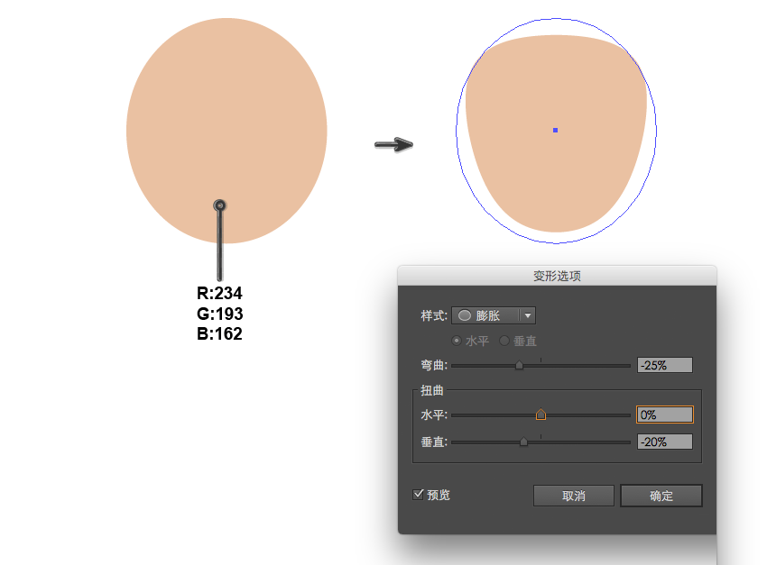使用椭圆工具(L),绘制一个椭圆(R:234 G:193 B:162)。要使头部具有不规则形状,需要选择效果>变形>膨胀,并输入下图中的参数。