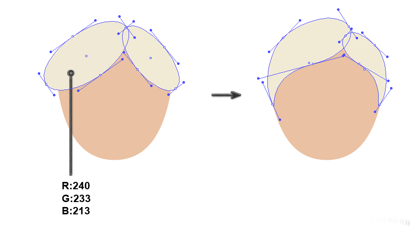 接下来我们开始绘制头发的顶部。用椭圆工具(L)绘制两个奶油色椭圆。使用直接选择工具(A)移动锚点的手柄来创建所需的形状。
