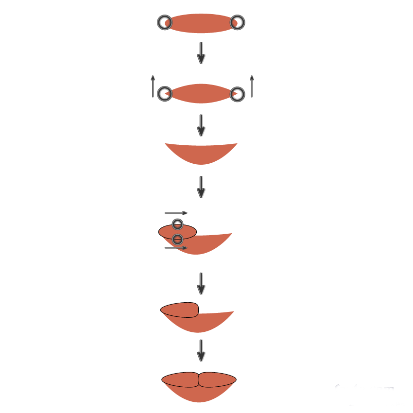 对于上唇,创建另一个小的红色椭圆。使用直接选择工具(A)选择顶部和底部锚点,然后向右移动。制作此形状的对称副本: 右键单击鼠标,然后选择 变换>对称。在对话框中,选择轴垂直,角度90度,然后复制。将此副本移动到右侧。嘴唇就绘制好了。