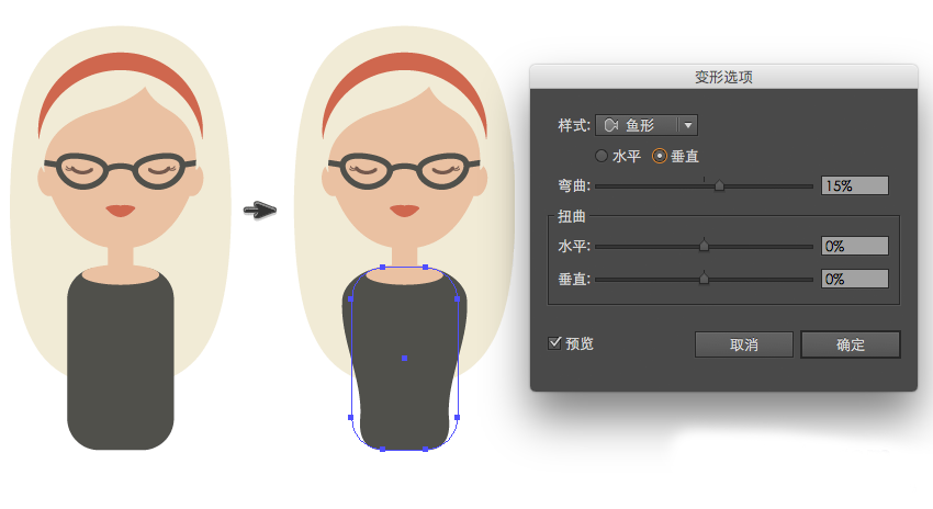 在这一步,我们将绘制女人的身体。使用圆角矩形工具,创建一个灰色的圆角矩形。让我们修改这个形状的底部。选择效果>变形>鱼形,输入下图中的参数。