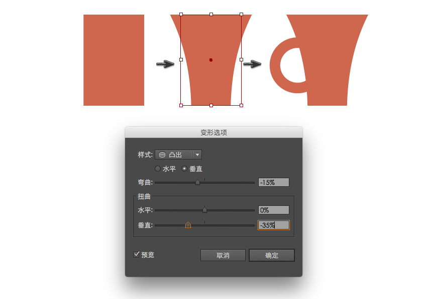 现在我们将绘制杯子。选择矩形工具(M)并创建一个矩形,选择效果>变形>凸出,输入下图中的参数。接下来绘制杯子的手把,创建一个椭圆,删除填充颜色并选取相同颜色的描边。