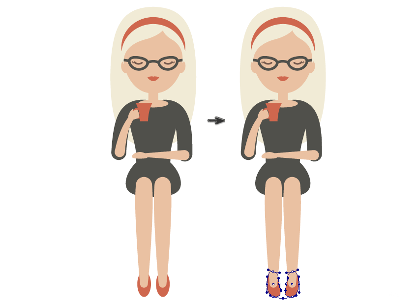 绘制鞋子,用椭圆工具(L)绘制椭圆,并将其放在腿的后面。使用直接选择工具(A),移动椭圆形的手柄以创建看起来像鞋子的形状。随意设计你最喜欢的鞋子吧!