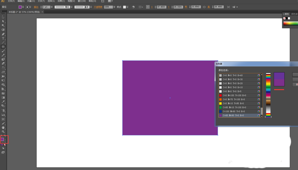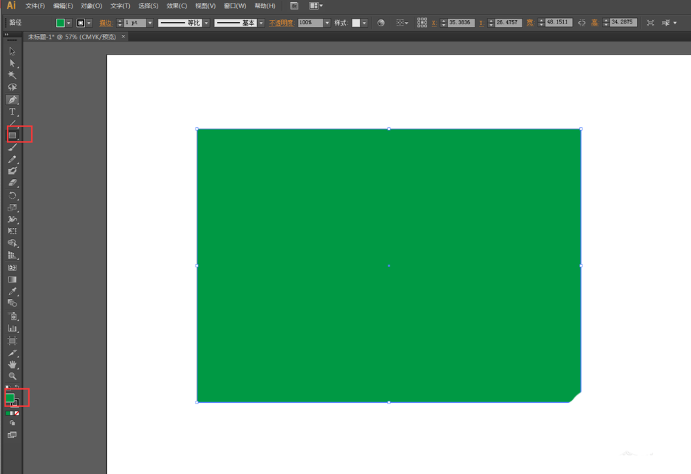 点击工具箱中的矩形工具,然后在画布中绘制一个矩形。然后点击工具箱中的颜色填充按钮。给矩形填充颜色。(如下图)