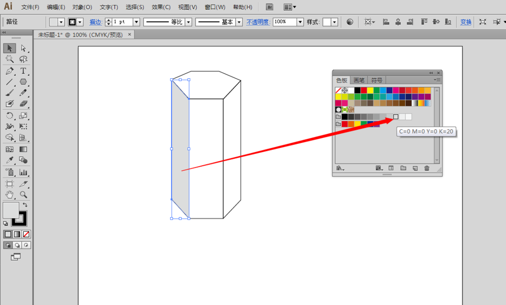5、使用“形状生成器工具”,让六棱柱的四面都生成图形以后,就可以填充颜色了。左侧那么填充一个浅灰颜色