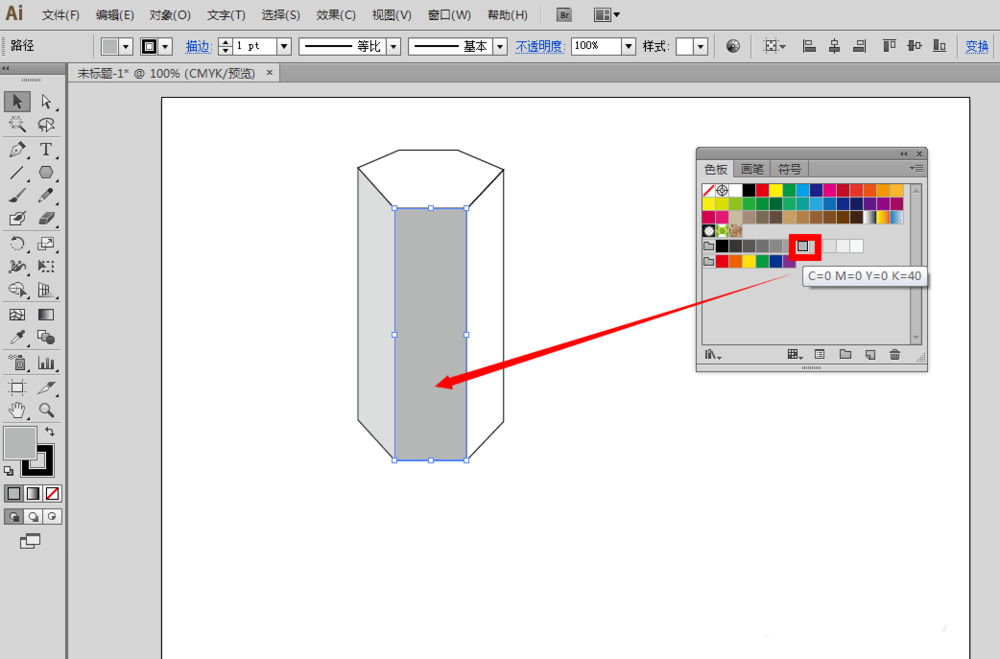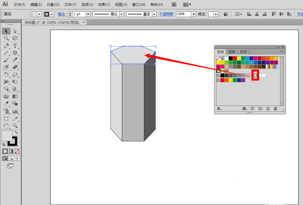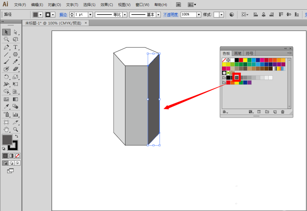 6、选中正面,在色板上点击一个大概中灰的颜色,给他填充上一个中灰颜色