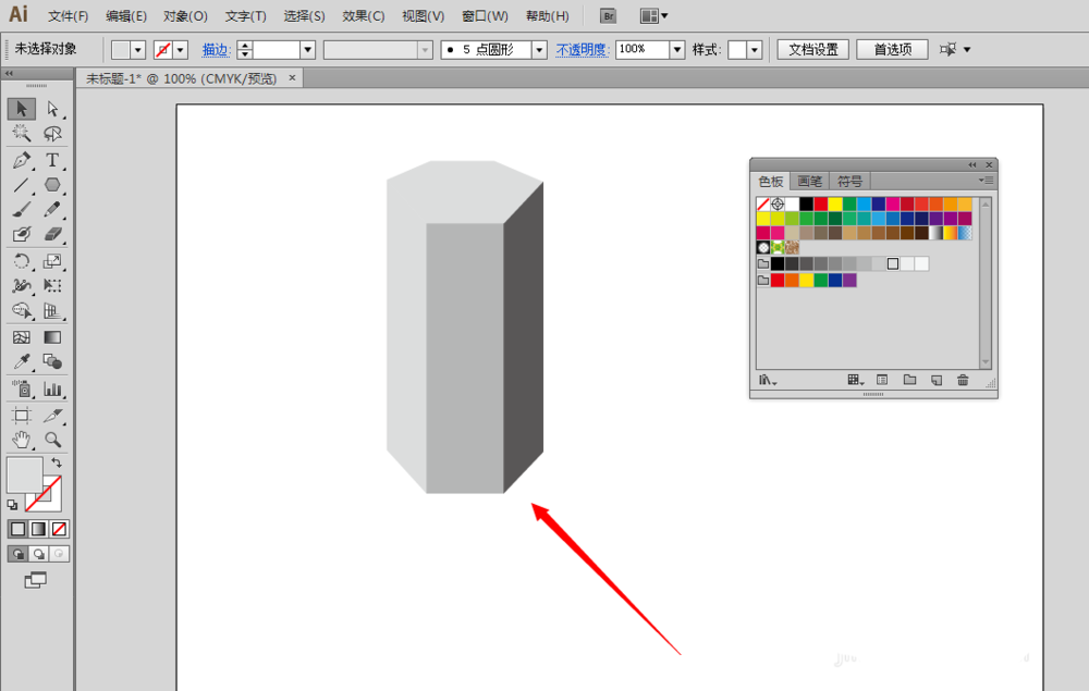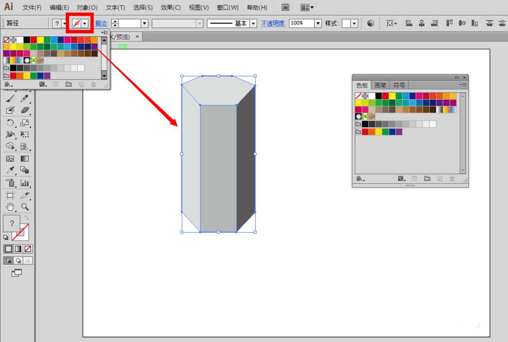 9、六棱柱的四面全部填充好颜色以后,选中图形,在描边颜色填充处设置为无,去掉黑色的描边