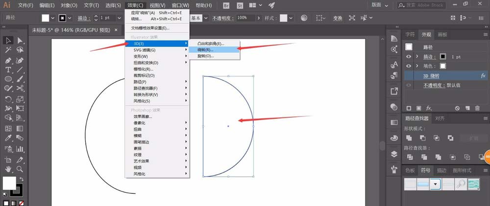 1、首先,我们在AI illustrator的画板上,绘制一个半圆型,我们可以使用钢笔工具自行绘制,或者利用圆形工具配合剪刀工具,裁剪一个半圆,之后进行3D命令。
