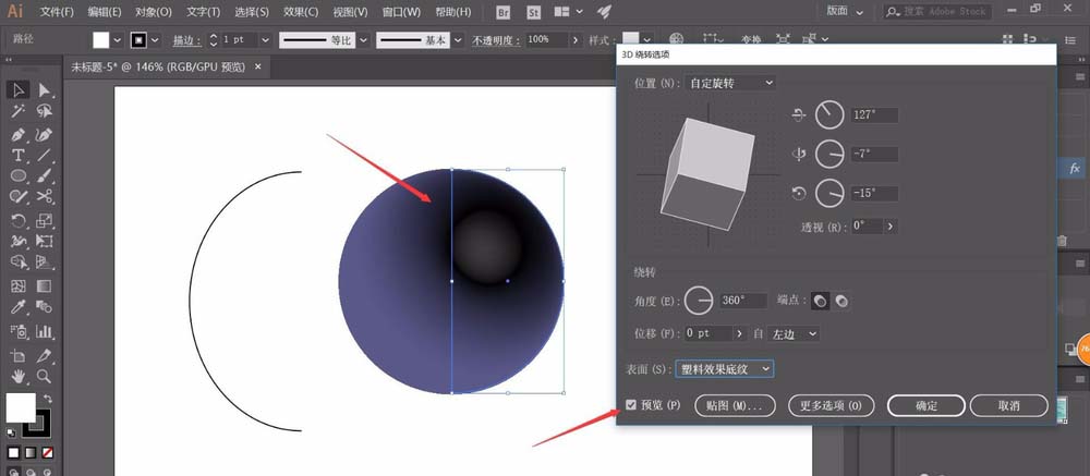 2、在3D命令确定后,在AI illustrator右侧就会出现一个窗口,我们勾选3D窗口下方的“预览”,即可看到3D效果的圆形,此时圆形是一个无贴图的纯黑。