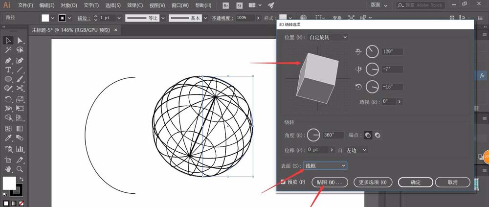 3、我们可以使用鼠标拖动3D窗口中的正方体,来调整观看视角,将“表面”选项设置为“线框”可以更好的看到具体的方位和整体效果。