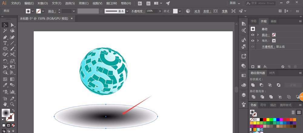 8、选择AI illustrator左侧工具栏中的“椭圆工具”,绘制一个圆形,使用黑色到白色的渐变效果进行填充,进行一个阴影效果的绘制,将圆形拖动为椭圆。