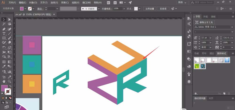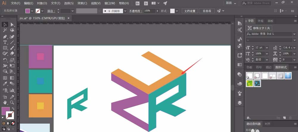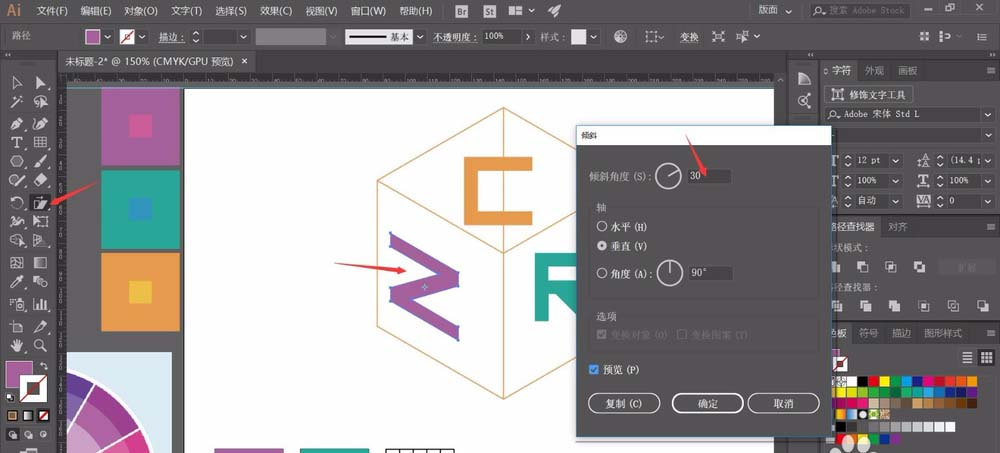 10、随后,将我们绘制好的字母,分别放置到六边形上的三个位置,在两边的字母选择“倾斜工具”,对齐进行“30°”和“-30°”的倾斜操作,上面的字母,选择旋转“45°”。