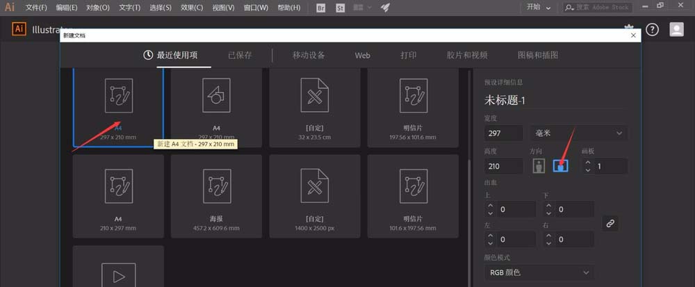 1、首先,我们开启Adobe illustrator,进入到Adobe illustrator的工作页面,选择新建命令,在Adobe illustrator弹出的新建窗口中,选择合适的模版后,点击“创建”即可。