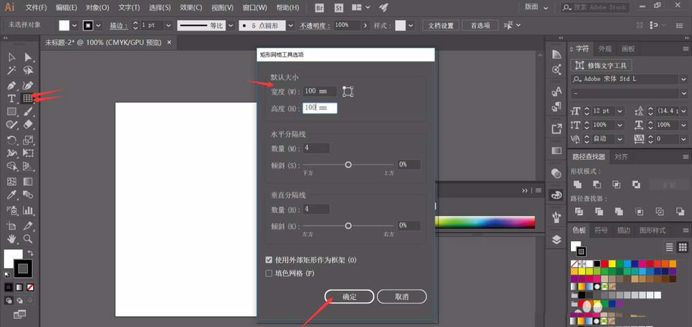 4、双击“矩形网格工具”,Adobe illustrator会弹出设置窗口,我们对网格进行简单的设置后,即可点击确定,这样绘制的网格就会依照我们的设置生成。