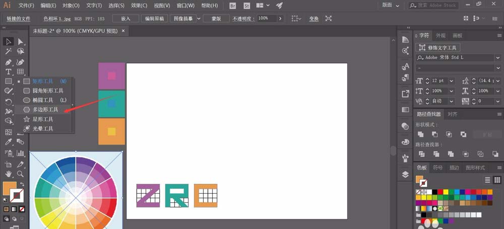 7、完成字母的绘制之后,我们右键点击“矩形工具”,在弹出的工具菜单中选择“多边形工具”,绘制一个多边形进行字母的放置。