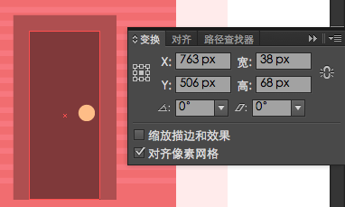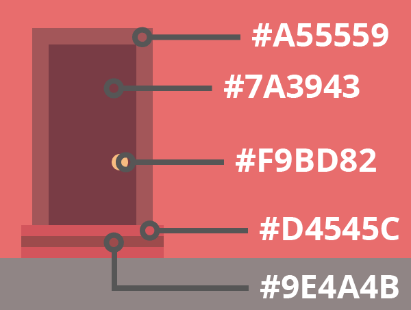 通过创建一个32 x 66px矩形(#7A3939),放入大门的内部,底部垂直对齐到大门。接下来,使用椭圆工具(L)创建一个6 x 6px的圆(#F9BD82),将作为我们的门把手,然后使用这些坐标定位它:(X:266px;Y:521px)要完成门还需创建一个52 x 12px的矩形(#EB6D6D),然后放置到门的最下方。 然后创建另一个的52 x 4px的矩形(#9E4A4B),并垂直和水平对齐到刚才做的以的形状。