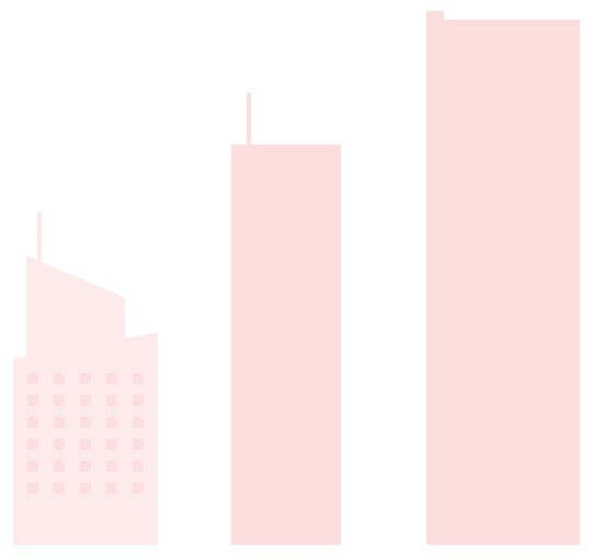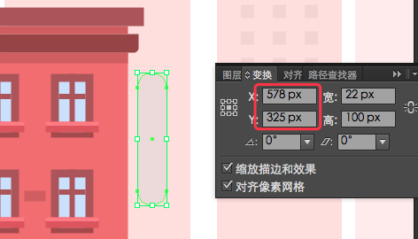 1.对于第五个建筑,创建一个94 x 422px的矩形,较浅的粉色(#FFEBEB),然后放置到距离第四个建筑10px的位置,确保底部对齐。再创建一个12 x 4px的矩形并将其定位如下:(X:812px;Y:132px)