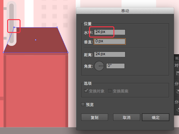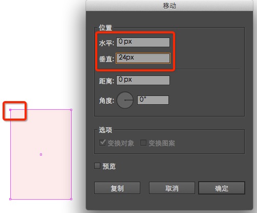 2.现在需要调整它的左上锚点,向下移动24个像素。 可以这样做,用直接选择工具(A)选择它的左上锚点,然后执行对象>变换>移动。出现一个弹出框,水平输入0px,垂直输入24px;