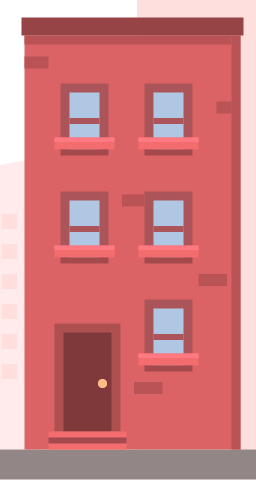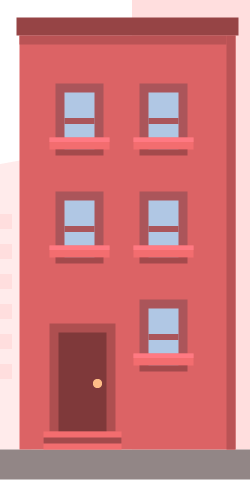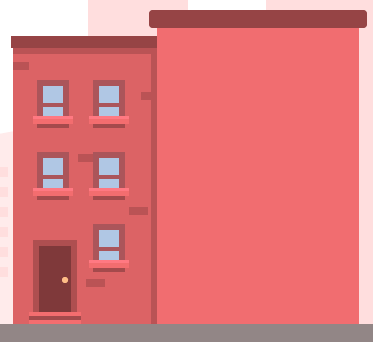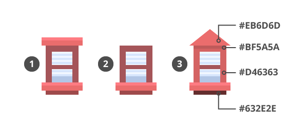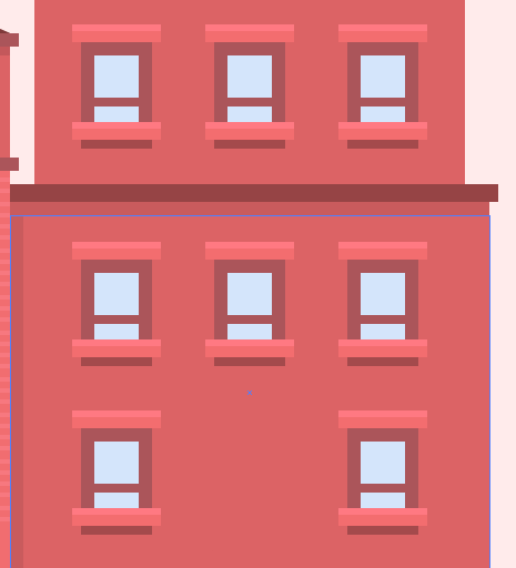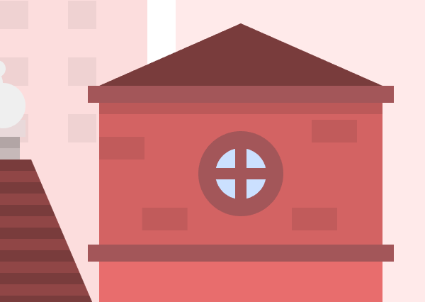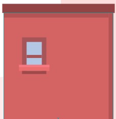 1.移动到第五个房子的图层上进行制作,我们将开始创建一个216 x 160px的矩形(#D46363),并将其放在第四个建筑的右侧。然后添加两个阴影(#C25B5B),一个在左边,一个在顶部,保持6px的恒定宽度。