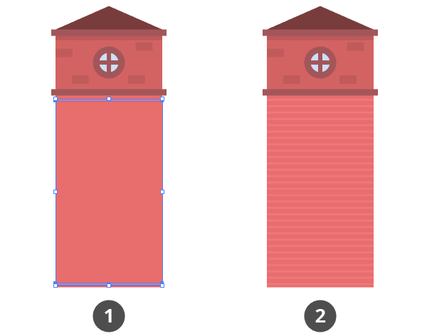 4.聚焦在建筑物的下部,我们需要创建堆叠的水平线。 要做到这一点,创建两个100 x 2px形状,使用较浅的阴影#EF787E颜色,并将其位置如下: