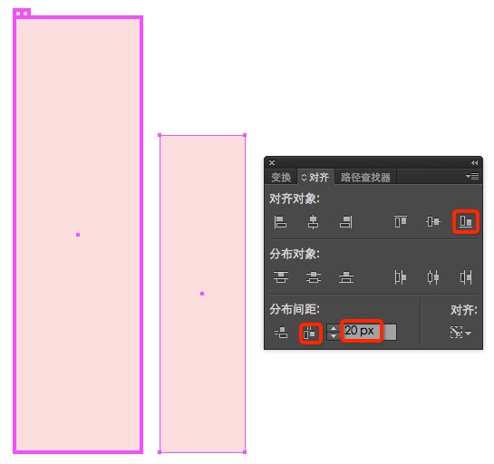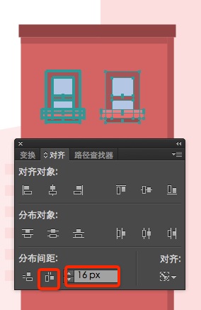 选中这两个窗口,按住alt点击第一个(把第一个设置为关键对象),在分布间距框填写16px,再点击水平分布间距;