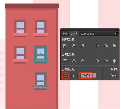 接下来,对第一个窗口进行了编组(command g),创建两个副本并将它们向右对齐,彼此之间的距离为16px。 再次将它们编组,并将它们复制两次,两者之间保持24px的距离,删除第三行的左侧窗口,为门留出空间,确保将所有窗口组合在一起(全选>command G )。