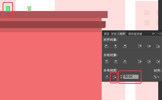 将这个窗口,复制四个[选中它然后按住Alt同时向左拖动四次],复制好后,选中这5个正方形,按住alt键点选最左边的正方形(意思就是以最左边的正方形为操作对象),再将分布间距栏写14px,再点击水平分布间距(如图)