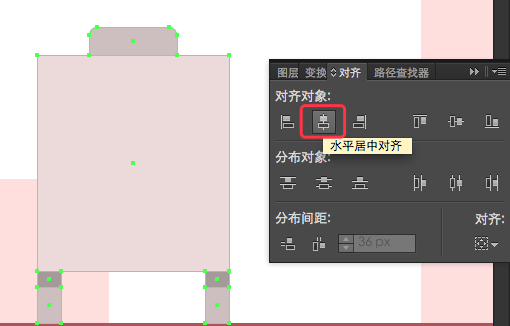 要完成水箱制作,只需添加三条水平线(48 x 2px),颜色使用#CCBEBF和位置距离水箱腿部分别为6px,34px和40px, 方法,同时选中水平线和水箱腿部,按住alt点选水箱腿部,同时调出对齐面板,在分布间距那填写6px,再点击最左侧的垂直分布间距,以下同理;