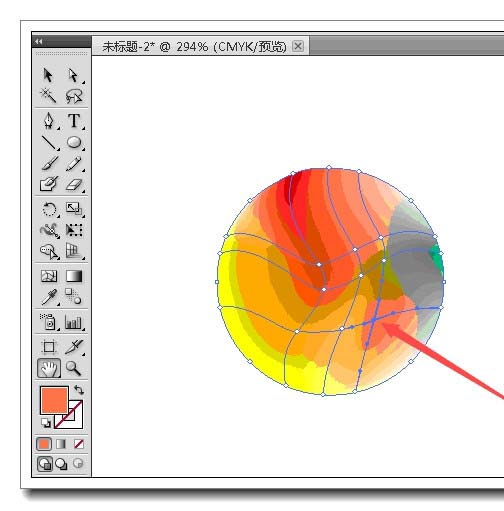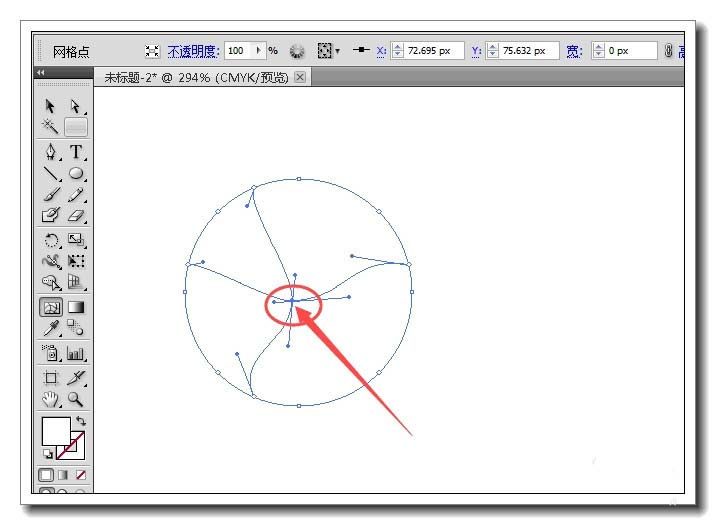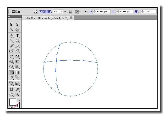 2、单击工具箱上的网格工具,在圆的内部单击一下,就形成一个一纵一横的网格线。