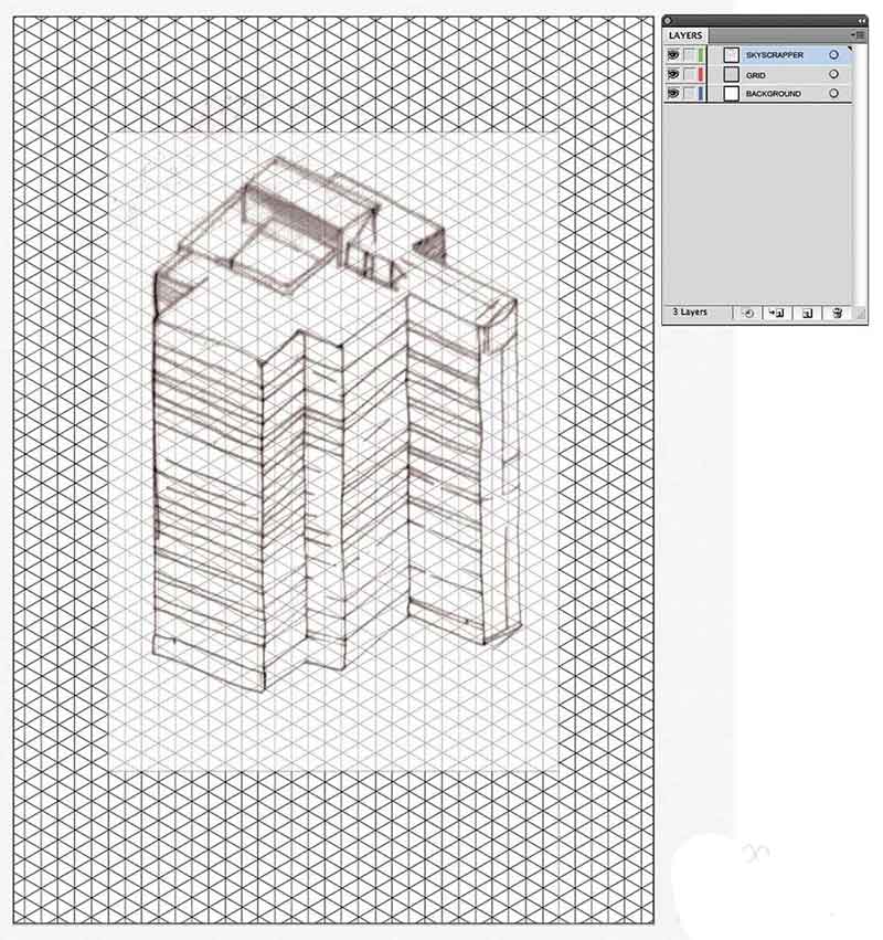 3、导入电网进入一个新的Illustrator文件,并锁定该层。现在,把你扫描了它的一个在一个单独的层,并设置不透明度为70%,从而使电网可以看到下面