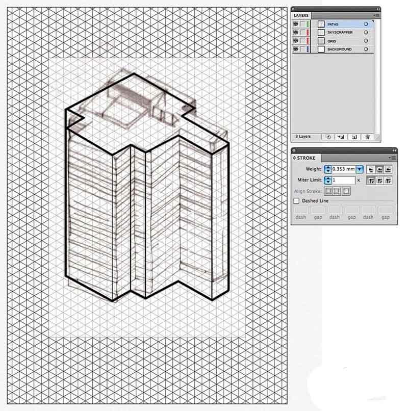 4、开始用钢笔工具(绘图P)。加入所有的路径了-不应该有悬垂位。保持干净并使用网格在30℃至水平达到直线。