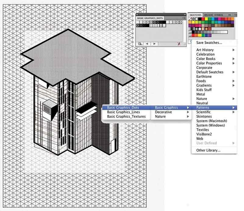 6、我们希望整体看是尖锐的,非常图形,所以使用内置的半色调黑白样本(来自斯沃琪面板或使用浏览窗口>色板库>模式>基本图形)