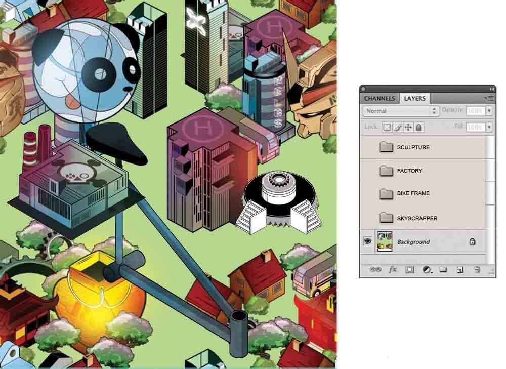 8、在Photoshop中,把每个元素在它自己的图层组。在每个组,创建元素下一个新的图层,命名为“颜色”。设置元素图层的混合模式为正片,然后去色层开始着色它。