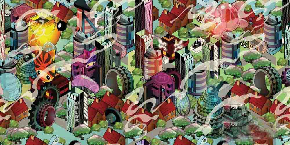 您可以轻松地结合等距绘制的对象与重复平铺来创建复杂的城市景观,为2xanadu演示